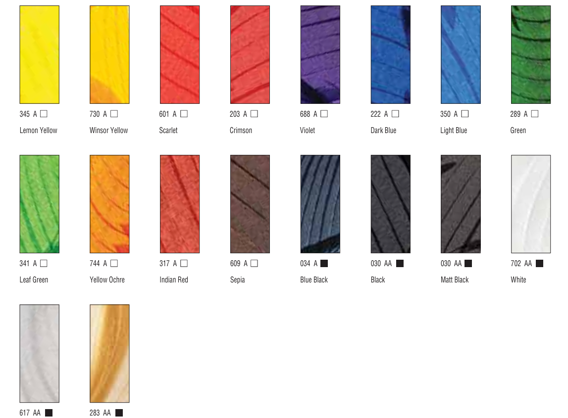 Alla bläck är framställda med så rena enkelpigment som möjligt för att möjliggöra rena och klara färgblandningar. Även om bläcken är mycket ljusäkta (klassade AA eller A), är de inte vattenfasta, vilket innebär att du kan bearbeta dem igen med vatten även efter att de har torkat.