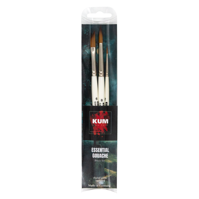 Detta Essential Gouache Brush Set, noggrant sammanställt av tyska KUM, är det perfekta penselsetet för att bemästra grunderna i gouachemåleri. Setet är utformat för att ge dig alla nödvändiga verktyg för mångsidig användning av gouachefärger – från mjuka färgövergångar och fina detaljer till att måla större ytor.